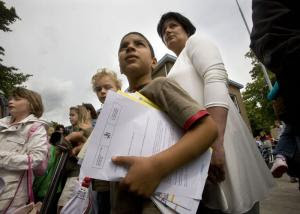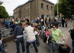 Ouders halen hun kinderen op op het schoolplein van de Cavaljéschool, waar woensdagochtend de 7-jarige Katja Leendertz tijdens de pauze werd ontvoerd. Foto: Herman Stöver.