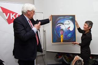 Voorzitter Peter Tromp van het Vader Kennis Centrum overhandigt de wisseltrofee bij de Vaderdagtrofee, een schilderij van kunstenaar Joep Zander, aan Perihan Utlu: